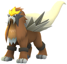 Entei contiene el fulgor del magma en su interior. Se cree que este Pokémon nació de la erupción de un volcán. Escupe numerosas ráfagas de fuego que devoran y reducen a cenizas todo lo que tocan.