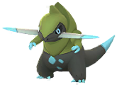 Fraxure, el Pokémon Boca Hacha. Es el número #0611 en la Pokédex Nacional.