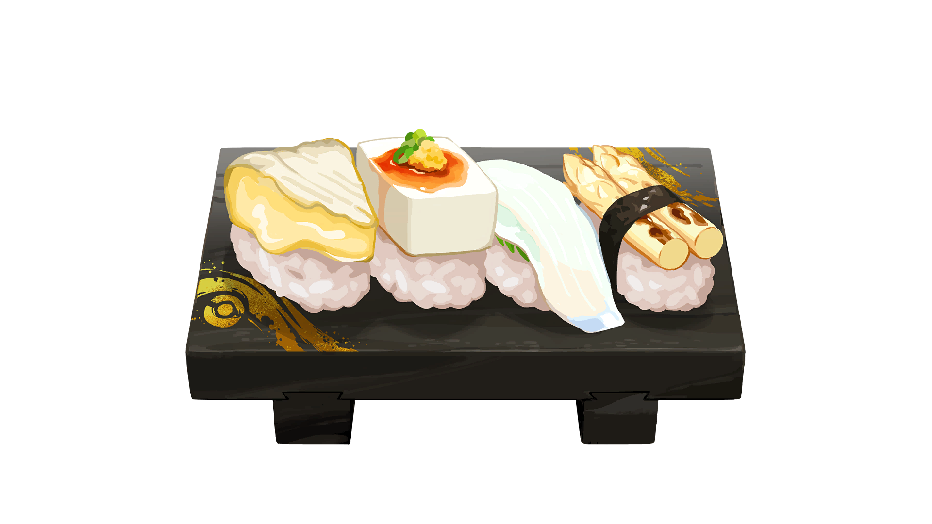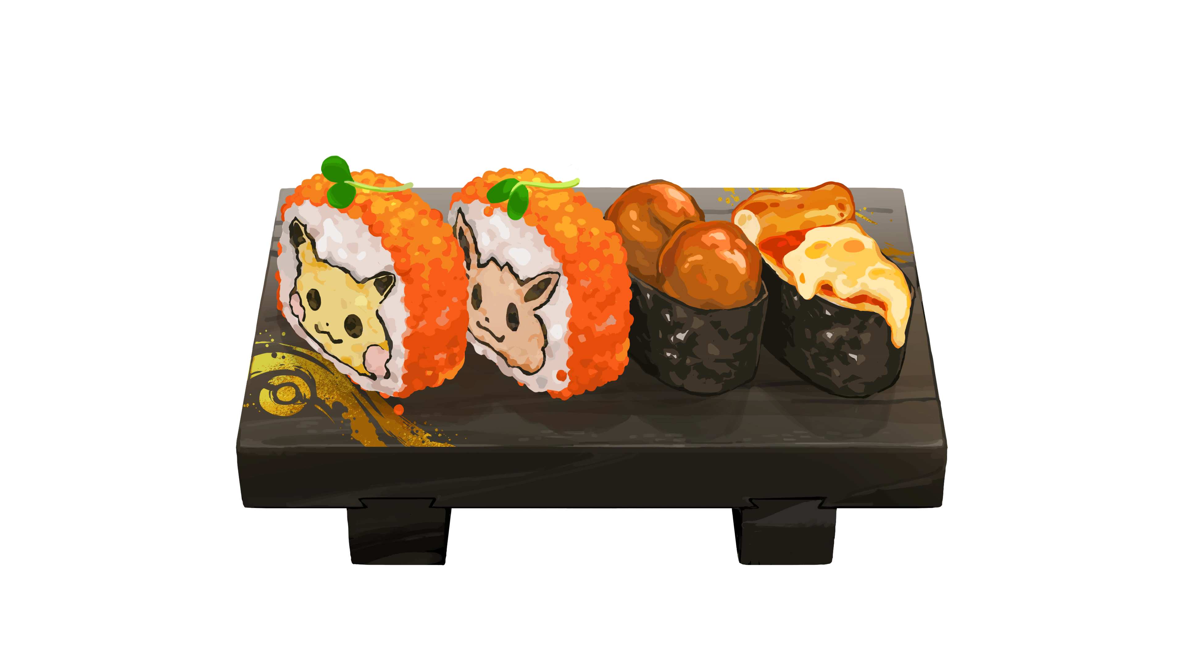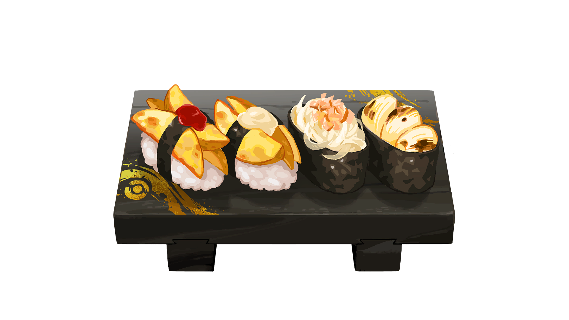 Cuatro piezas distintas de sushi con diseños muy cucos. Por alguna razón, todas tienen un sabor bastante dulce.