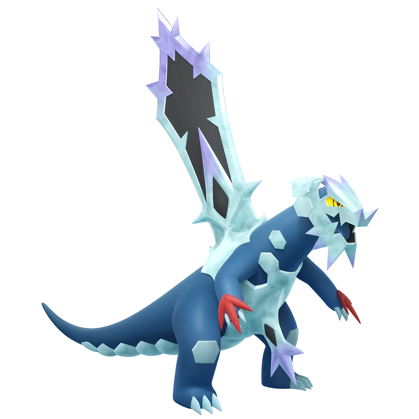 Gracias a la megaevolución, este Pokémon puede generar más energía gélida, y la enorme placa dorsal de su espalda se vuelve más grande aún. Baxcalibur solo necesita el peso de esta placa para partir cualquier cosa por la mitad o destruirlo por completo.