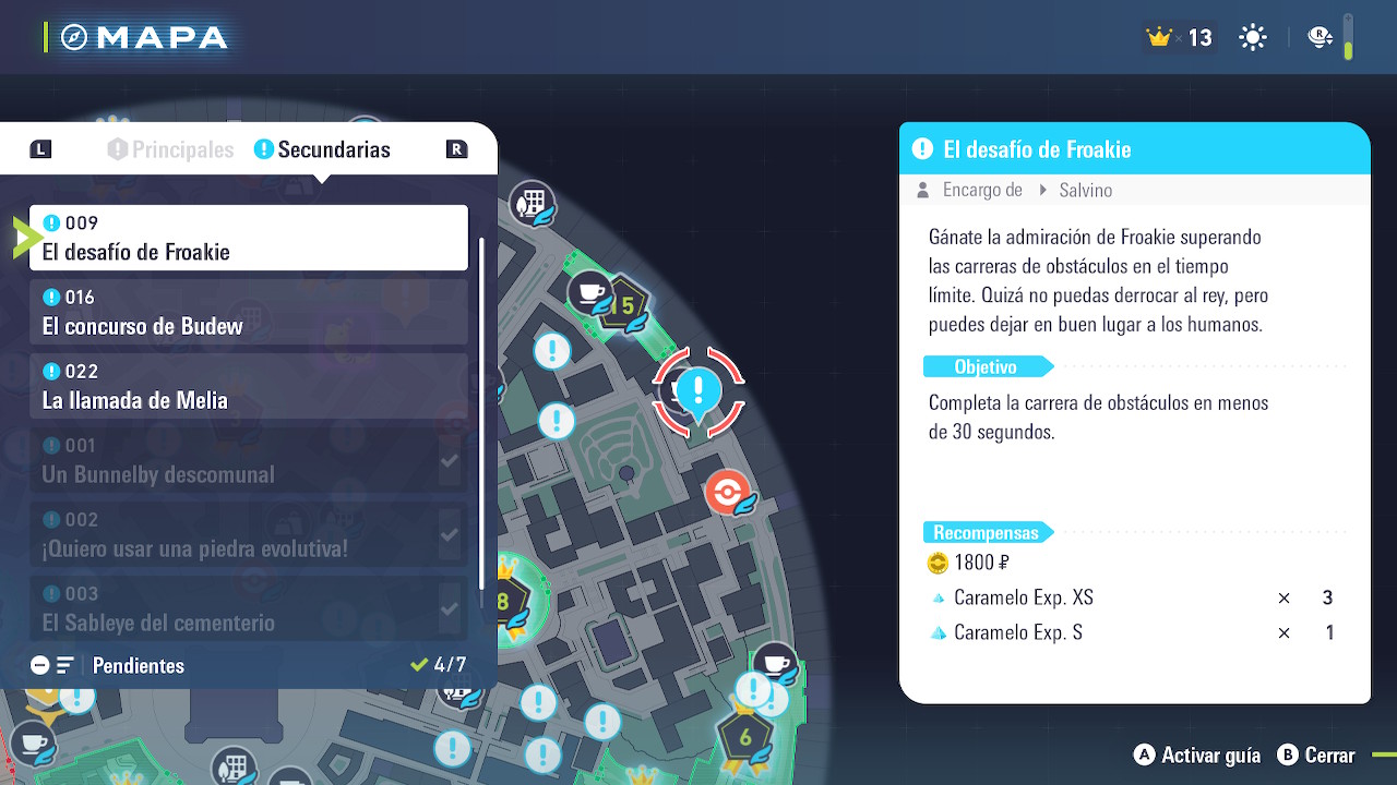 9. El desafío de Froakie | Gánate la admiración de Froakie superando las carreras de obstáculos en el tiempo límite. Quizá no puedas derrocar al rey, pero puedes dejar en buen lugar a los humanos. |
