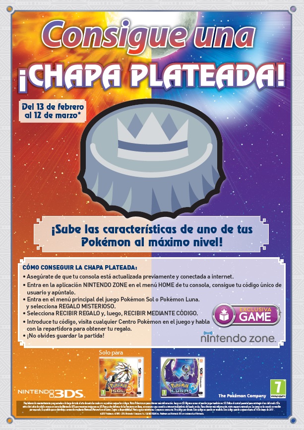 ¡Entrenadores de España! Desde hoy hasta el 12 de marzo podemos conseguir una Chapa Plateada para Sol y Luna de forma exclusiva en la Nintendo Zone de nuestra tienda GAME más cercana. Con ella, podremos subir al máximo las estadísticas de uno de los Pokémon de nuestro equipo.