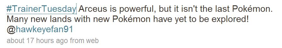 Desde el pasado 3 de diciembre, la web oficial de Pokémon en América se ha aventurado en la red social Twitter. Esto es con el fin de mantener al tanto a los fans de Pokémon, de nuevas noticias y actualizaciones sobre Pokémon en América, especialmente para el país de Estados Unidos. Así mismo, TPCI en su Twitter ofrece un segmento simlar a la sección Mailbag de su web a al cual lo denominaron "Trainer Tuesday" (Martes de Entrenadores), en donde los usuarios tienen la oportunidad de hacer sus preguntas y ser contestadas. Curiosamente entre todas esas preguntas, un usuario preguntó sobre una posible continuación de la historia de Pokémon y esto fué lo que TPCI respondió.