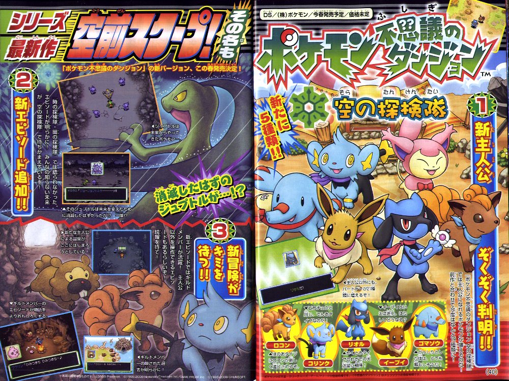 Luego de varios scans e imágenes de mala calidad y después de muchas especulaciones rondando por ahí, ya podemos observar un scan de alta calidad de la revista CoroCoro sobre el nuevo juego Pokémon Mundo Misterioso: Exploradores del Cielo.