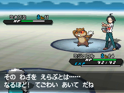 | Mirto, pidiéndote que le acompañes. | Bel, entregándote a tu Pokémon Inicial. | Tu primer combate de gimnasio, contra Cheren. |