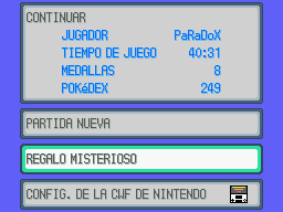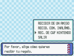 Entra en este modo, y selecciona “RECIBIR REGALO” y luego “REC. DE CWF NINTENDO“. Al recibirlo, vuelve a la pantalla del titulo y arranca tu partida guardada.