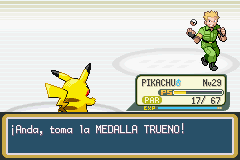 Tras esto, podrás acercarte al Lt. Surge y luchar contra su equipo de Pokémon de tipo Eléctrico. Cuando le venzas, ganarás la Medalla Trueno.