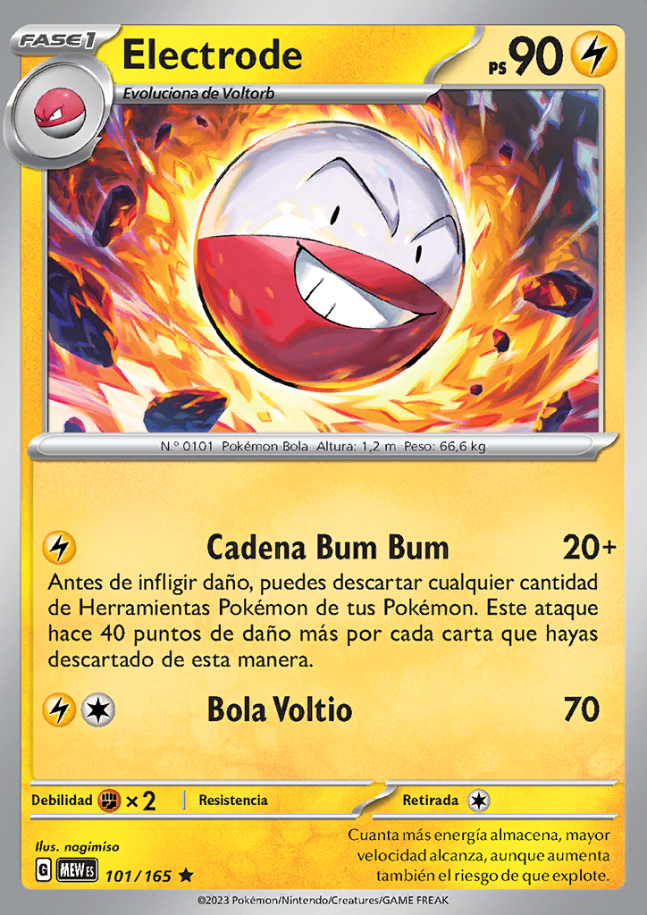Cadena Bum Bum Antes de infligir daño, puedes descartar cualquier cantidad de Herramientas Pokémon de tus Pokémon. Este ataque hace 40 puntos de daño más por cada carta que hayas descartado de esta manera. |