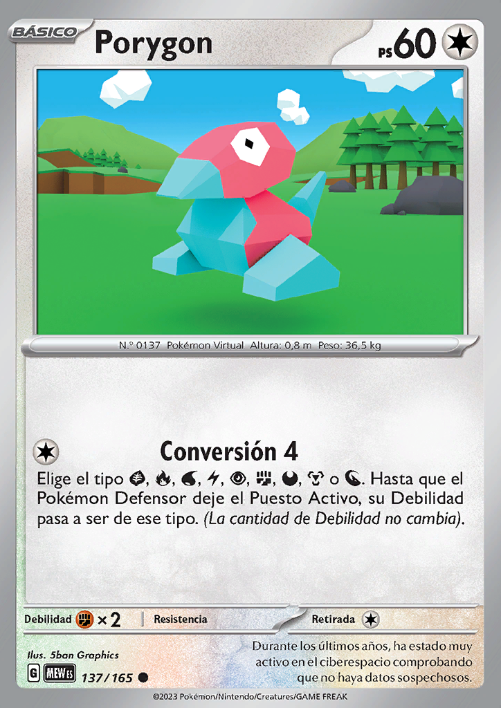 Conversión 4 Elige el tipo , , , , , , , o . Hasta que el Pokémon Defensor deje el Puesto Activo, su Debilidad pasa a ser de ese tipo. (La cantidad de Debilidad no cambia). |
