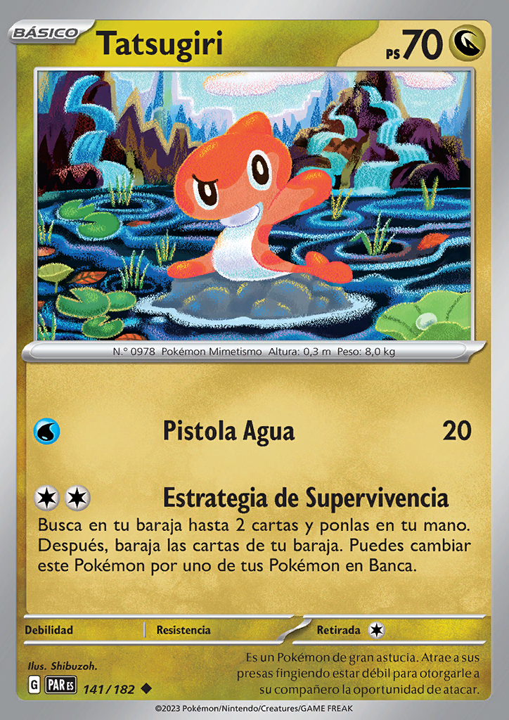 Estrategia de Supervivencia Busca en tu baraja hasta 2 cartas y ponlas en tu mano. Después, baraja las cartas de tu baraja. Puedes cambiar este Pokémon por uno de tus Pokémon en Banca. |
