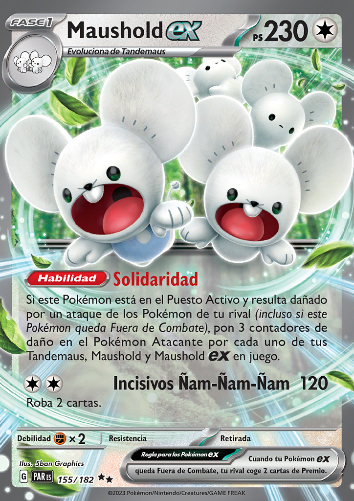 | Si este Pokémon está en el Puesto Activo y resulta dañado por un ataque de los Pokémon de tu rival (incluso si este Pokémon queda Fuera de Combate), pon 3 contadores de daño en el Pokémon Atacante por cada uno de tus Tandemaus, Maushold y Maushold ex en juego. | |