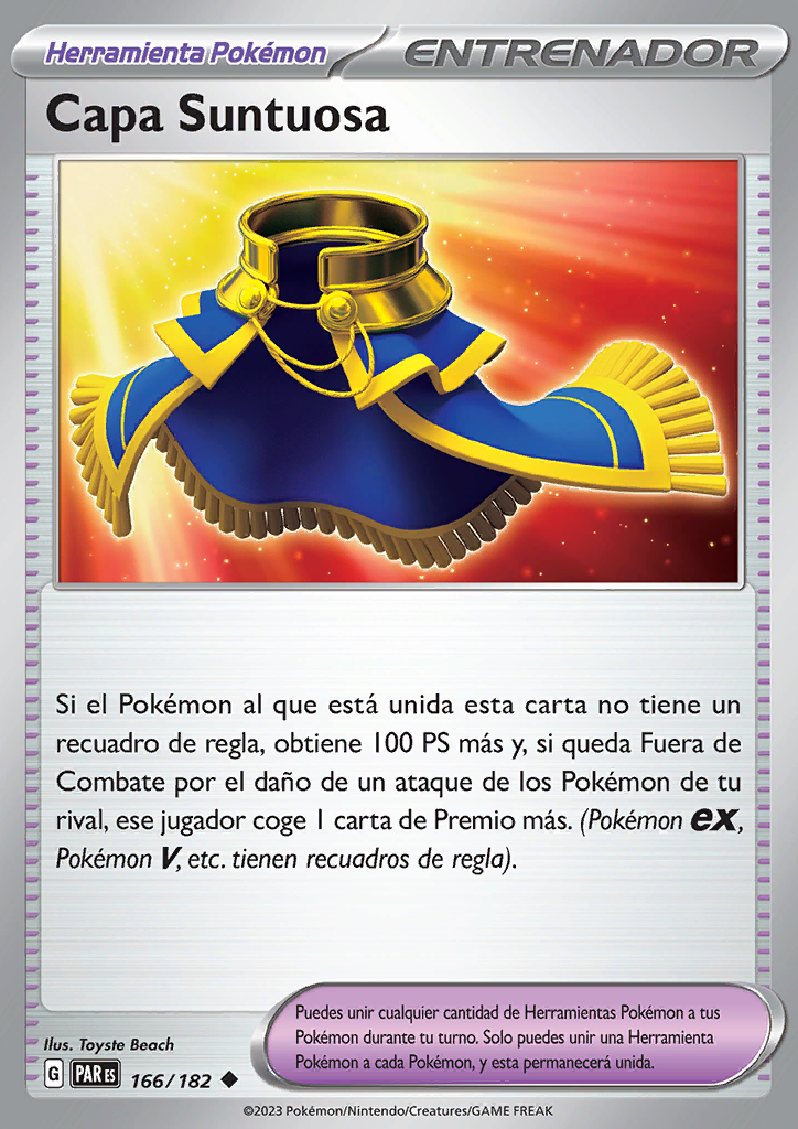 | Si el Pokémon al que está unida esta carta no tiene un recuadro de regla, obtiene 100 PS más y, si queda Fuera de Combate por el daño de un ataque de los Pokémon de tu rival, ese jugador coge I carta de Premio más. (Pokémon ex, Pokémon V, etc. tienen recuadros de regla). |