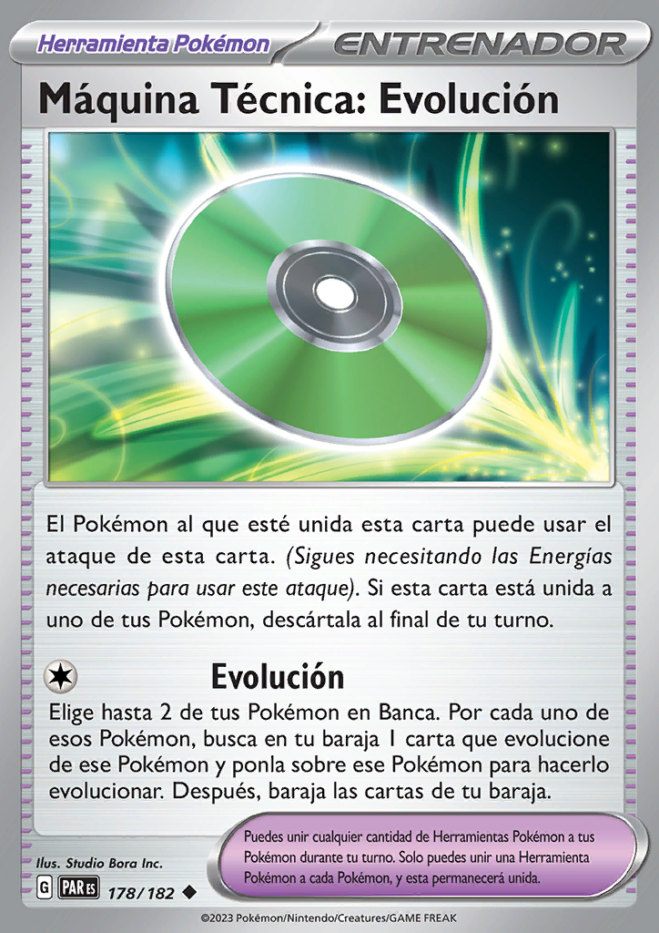 Evolución Elige hasta 2 de tus Pokémon en Banca. Por cada uno de esos Pokémon, busca en tu baraja I carta que evolucione de ese Pokémon y ponla sobre ese Pokémon para hacerlo evolucionar. Después, baraja las cartas de tu baraja. |