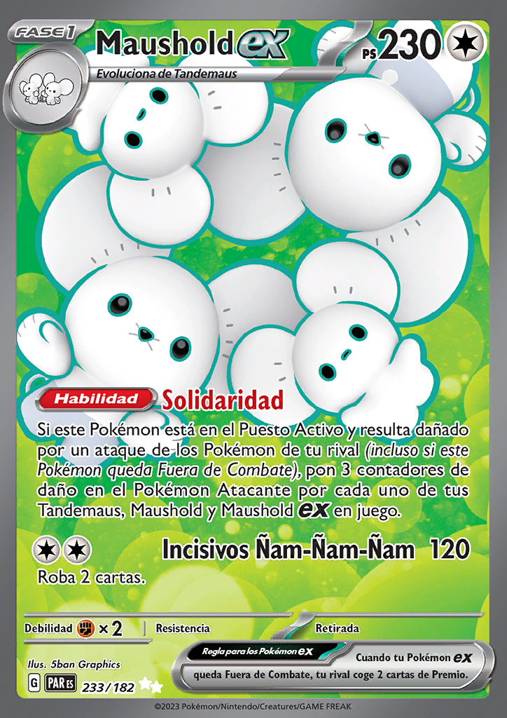 Si este Pokémon está en el Puesto Activo y resulta dañado por un ataque de los Pokémon de tu rival (incluso si este Pokémon queda Fuera de Combate), pon 3 contadores de daño en el Pokémon Atacante por cada uno de tus Tandemaus, Maushold y Maushold ex en juego.