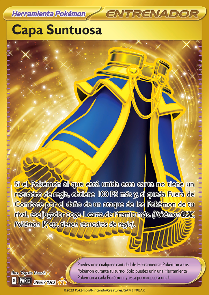 | Si el Pokémon al que está unida esta carta no tiene un recuadro de regla, obtiene 100 PS más y, si queda Fuera de Combate por el daño de un ataque de los Pokémon de tu rival, ese jugador coge I carta de Premio más. (Pokémon ex, Pokémon V, etc. tienen recuadros de regla). |