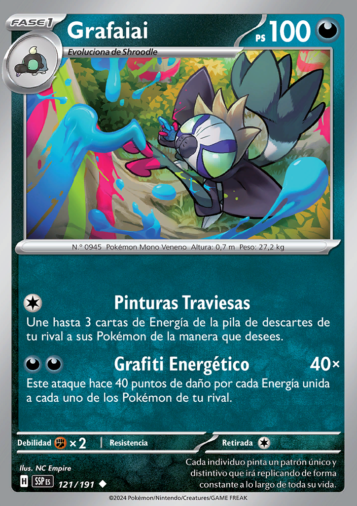 Grafiti Energético Este ataque hace 40 puntos de daño por cada Energía unida a cada uno de los Pokémon de tu rival. |