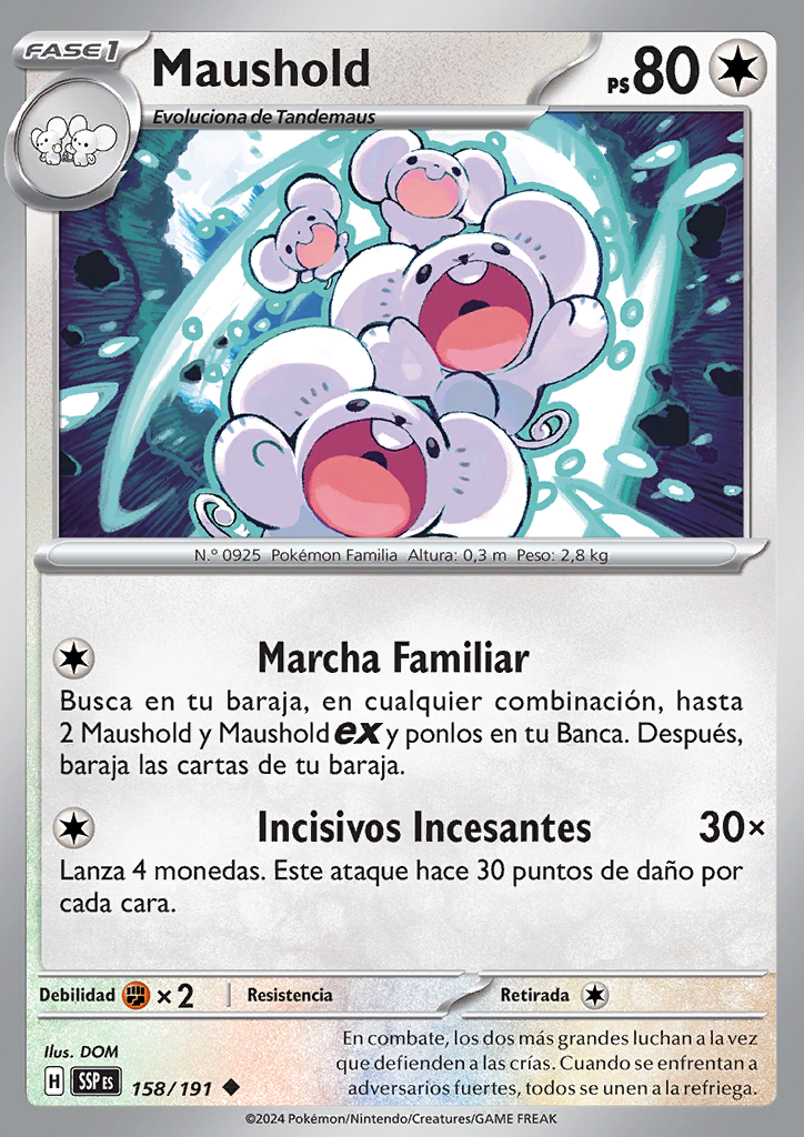 Marcha Familiar Busca en tu baraja, en cualquier combinación, hasta 2 Maushold y Maushold ex y ponlos en tu Banca. Después, baraja las cartas de tu baraja. |