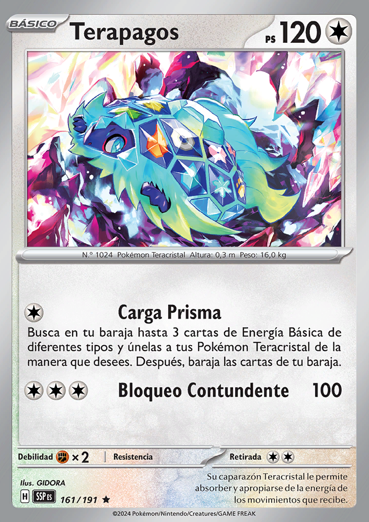 Carga Prisma Busca en tu baraja hasta 3 cartas de Energía Básica de diferentes tipos y únelas a tus Pokémon Teracristal de la manera que desees. Después, baraja las cartas de tu baraja. |