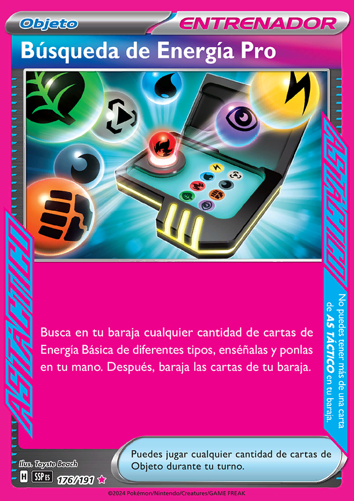 | Busca en tu baraja cualquier cantidad de cartas de Energía Básica de diferentes tipos, enséñalas y ponlas en tu mano. Después, baraja las cartas de tu baraja. |