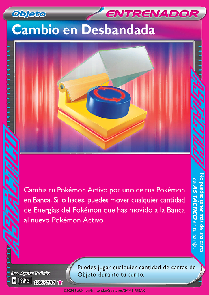 | Cambia tu Pokémon Activo por uno de tus Pokémon en Banca. Si lo haces, puedes mover cualquier cantidad de Energías del Pokémon que has movido a la Banca al nuevo Pokémon Activo. |