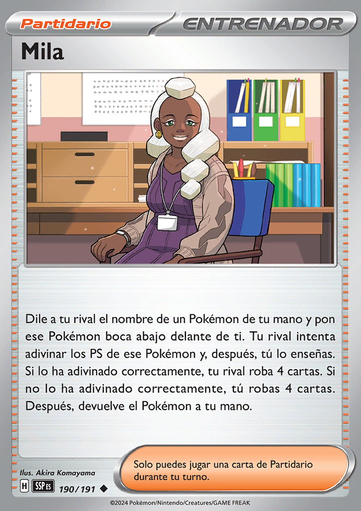 | Dile a tu rival el nombre de un Pokémon de tu mano y pon ese Pokémon boca abajo delante de ti. Tu rival intenta adivinar los PS de ese Pokémon y, después, tú lo enseñas. Si lo ha adivinado correctamente, tu rival roba 4 cartas. Si no lo ha adivinado correctamente, tú robas 4 cartas. Después, devuelve el Pokémon a tu mano. |