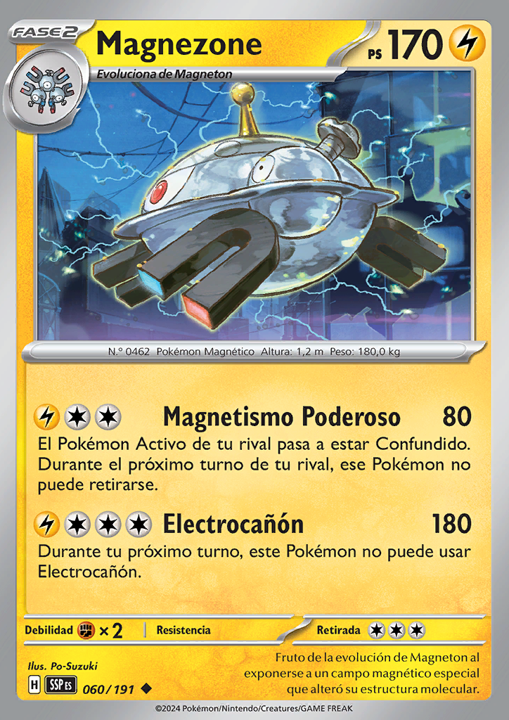 Magnetismo Poderoso El Pokémon Activo de tu rival pasa a estar Confundido. Durante el próximo turno de tu rival, ese Pokémon no puede retirarse. |