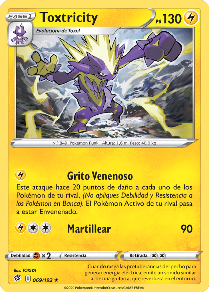 Grito Venenoso Este ataque hace 20 puntos de daño a cada uno de los Pokémon de tu rival. (No apliques Debilidad y Resistencia a los Pokémon en Banca). El Pokémon Activo de tu rival pasa a estar Envenenado. |