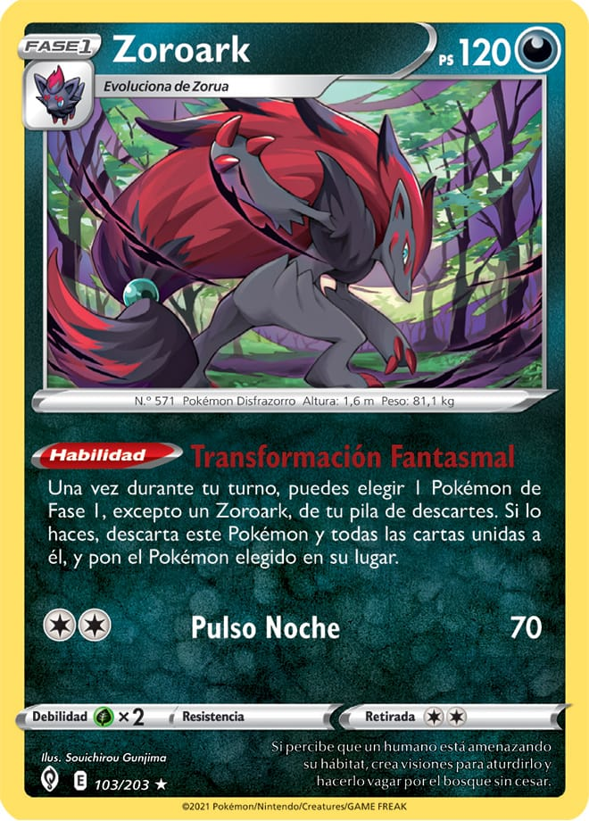 | Una vez durante tu turno, puedes elegir 1 Pokémon de Fase 1, excepto un Zoroark, de tu pila de descartes. Si lo haces, descarta este Pokémon y todas las cartas unidas a él, y pon el Pokémon elegido en su lugar. | |