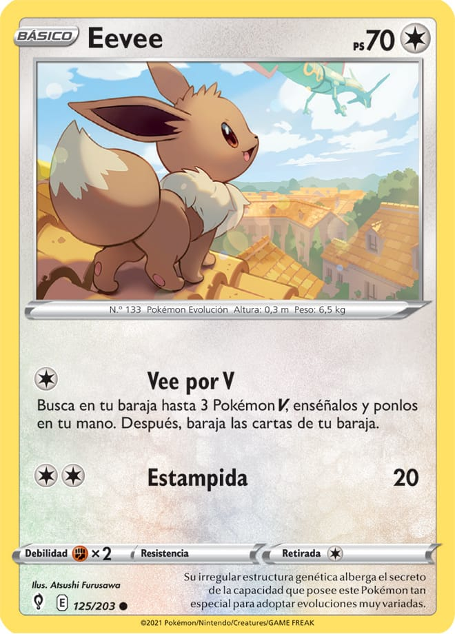 Vee por V Busca en tu baraja hasta 3 Pokémon V, enséñalos y ponlos en tu mano. Después, baraja las cartas de tu baraja. |