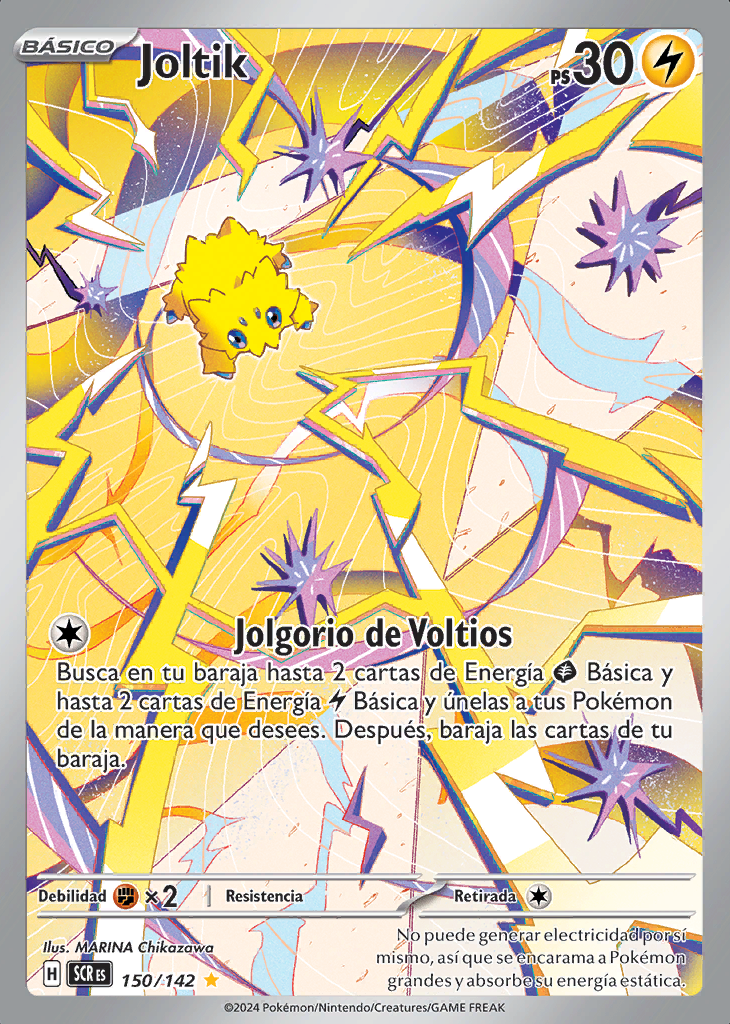 Jolgorio de Voltios Busca en tu baraja hasta 2 cartas de Energía Básica y hasta 2 cartas de Energía Básica y únelas a tus Pokémon de la manera que desees. Después, baraja las cartas de tu baraja. |