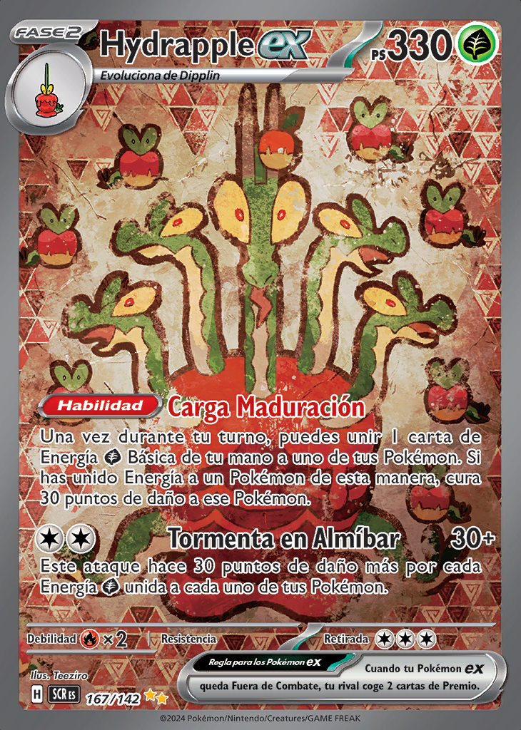 | Una vez durante tu turno, puedes unir 1 carta de Energía Básica de tu mano a uno de tus Pokémon. Si has unido Energía a un Pokémon de esta manera, cura 30 puntos de daño a ese Pokémon. | |