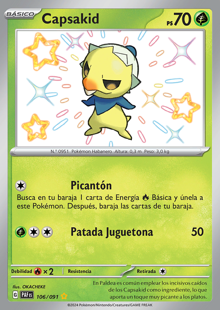Picantón Busca en tu baraja 1 carta de Energía Fire Básica y únela a este Pokémon. Después, baraja las cartas de tu baraja. |