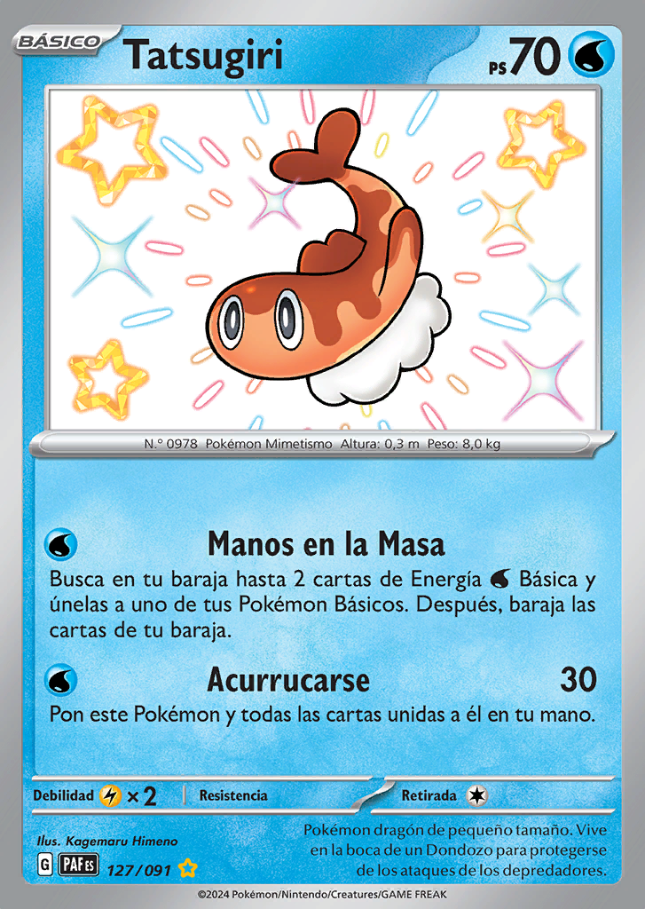 Manos en la Masa Busca en tu baraja hasta 2 cartas de Energía Básica y únelas a uno de tus Pokémon Básicos. Después, baraja las cartas de tu baraja. |