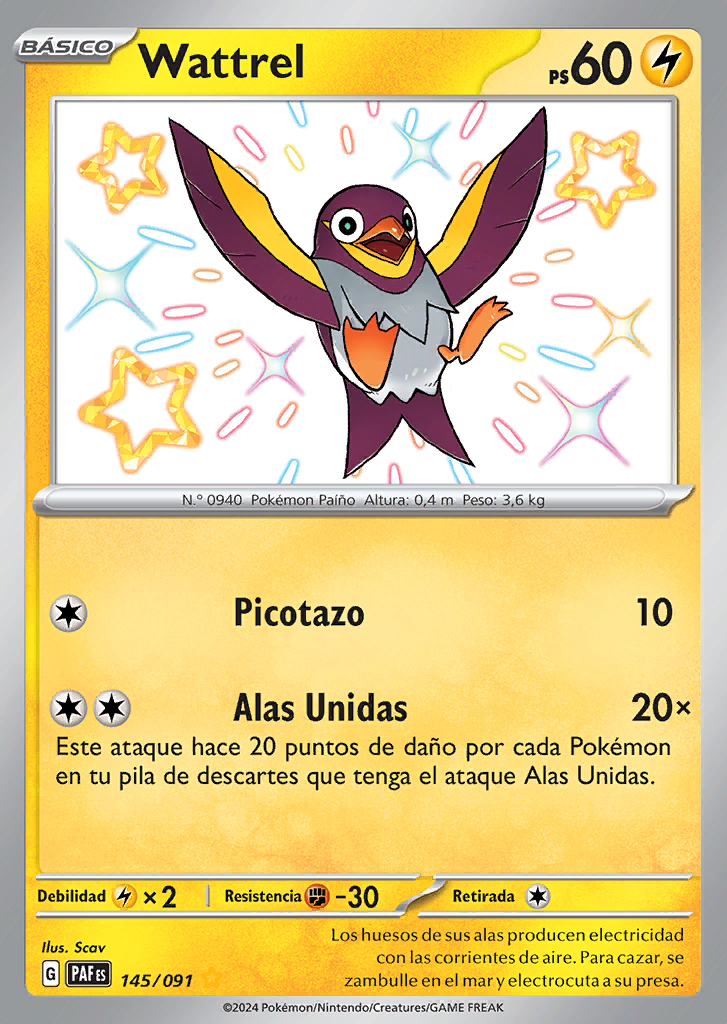 Alas Unidas Este ataque hace 20 puntos de daño por cada Pokémon en tu pila de descartes que tenga el ataque Alas Unidas. |