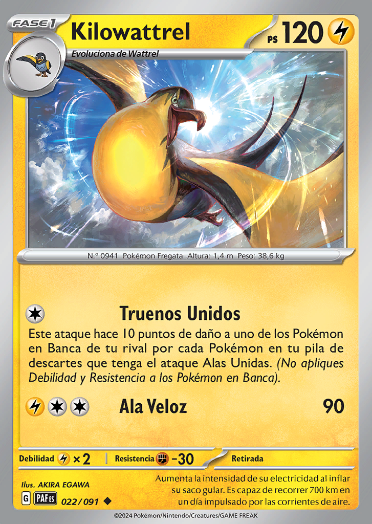 Truenos Unidos Este ataque hace 10 puntos de daño a uno de los Pokémon en Banca de tu rival por cada Pokémon en tu pila de descartes que tenga el ataque Alas Unidas. (No apliques Debilidad y Resistencia a los Pokémon en Banca). |