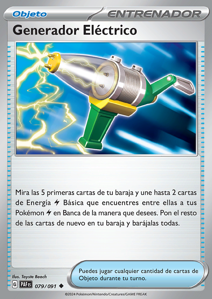 | Mira las 5 primeras cartas de tu baraja y une hasta 2 cartas de Energía Básica que encuentres entre ellas a tus Pokémon en Banca de la manera que desees. Pon el resto de las cartas de nuevo en tu baraja y barájalas todas. |