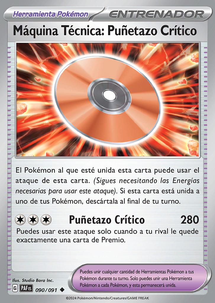 | El Pokémon al que esté unida esta carta puede usar el ataque de esta carta. (Sigues necesitando las Energías necesarias para usar este ataque). Si esta carta está unida a uno de tus Pokémon, descártala al final de tu turno. | ||