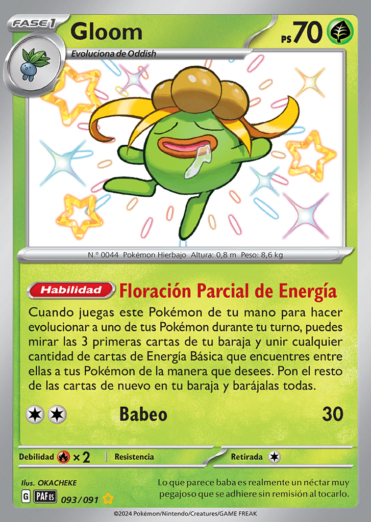 | Cuando juegas este Pokémon de tu mano para hacer evolucionar a uno de tus Pokémon durante tu turno, puedes mirar las 3 primeras cartas de tu baraja y unir cualquier cantidad de cartas de Energía Básica que encuentres entre ellas a tus Pokémon de la manera que desees. Pon el resto de las cartas de nuevo en tu baraja y barájalas todas. | |