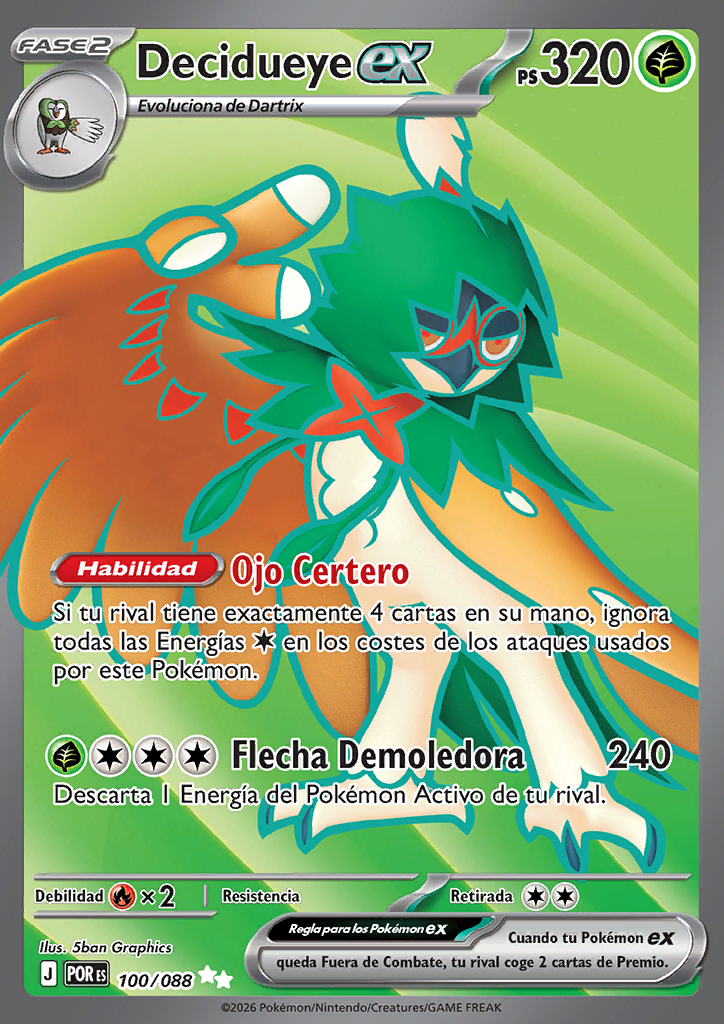 | Si tu rival tiene exactamente 4 cartas en su mano, ignora todas las Energías en los costes de los ataques usados por este Pokémon. | |