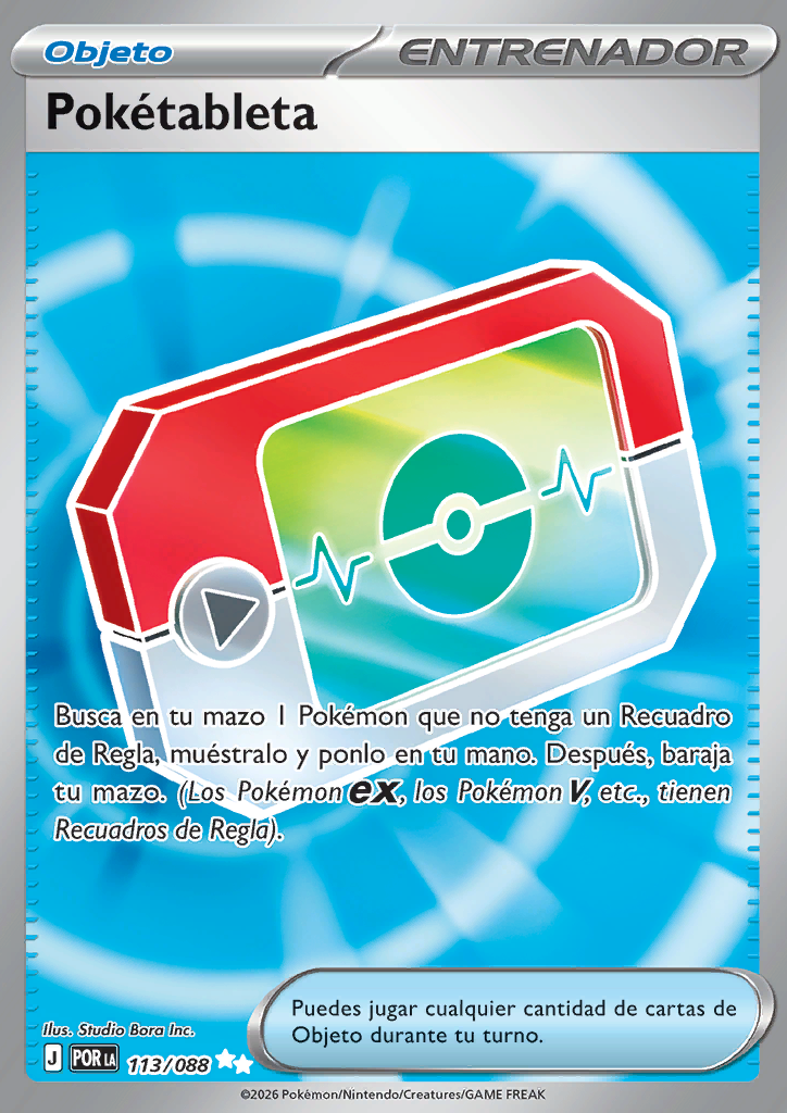 | Busca en tu baraja 1 Pokémon que no tenga un recuadro de regla, enséñalo y ponlo en tu mano. Después, baraja las cartas de tu baraja. (Los Pokémon ex, Pokémon V, etc., tienen recuadros de regla). |