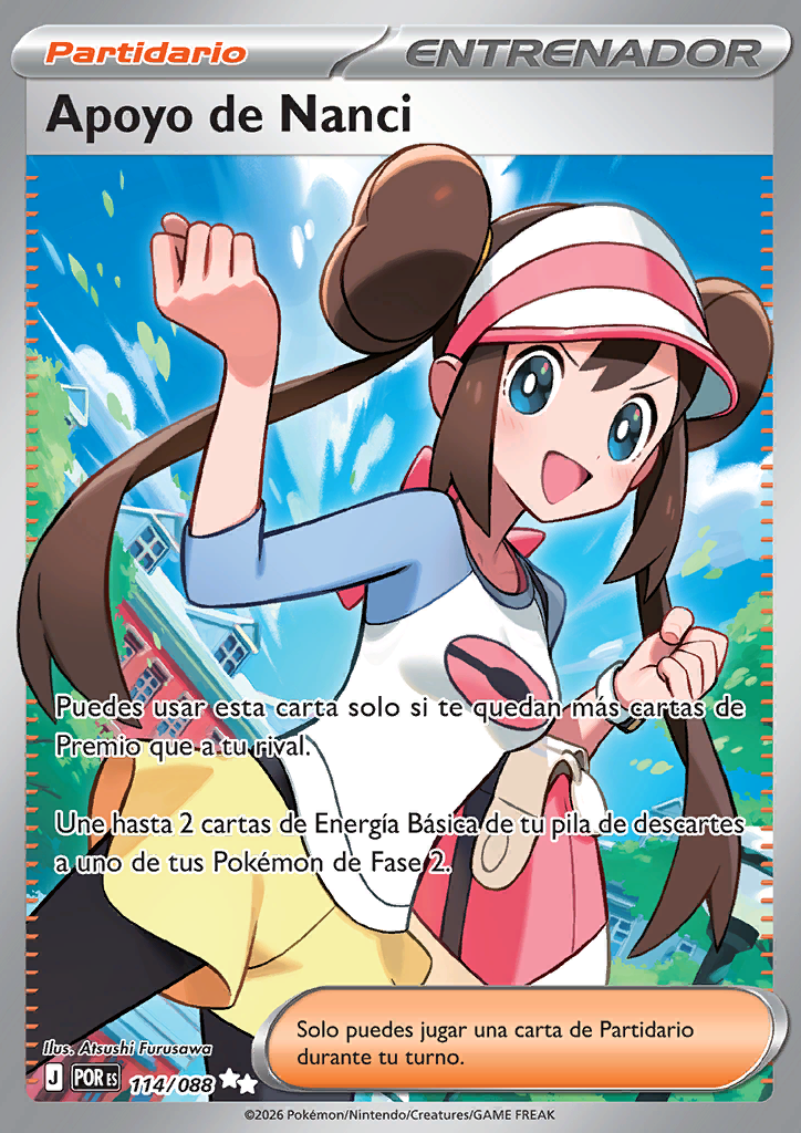 Puedes usar esta carta solo si te quedan más cartas de Premio que a tu rival. Une hasta 2 cartas de Energía Básica de tu pila de descartes a uno de tus Pokémon de Fase 2. |