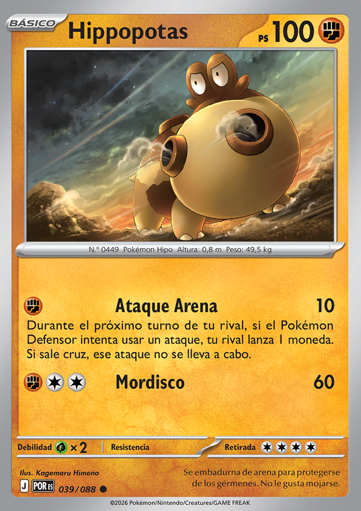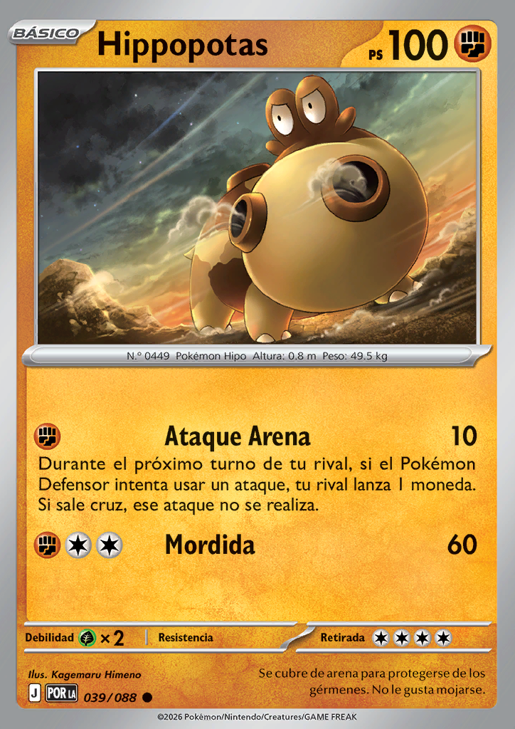 Ataque Arena Durante el próximo turno de tu rival, si el Pokémon Defensor intenta usar un ataque, tu rival lanza 1 moneda. Si sale cruz, ese ataque no se lleva a cabo. |