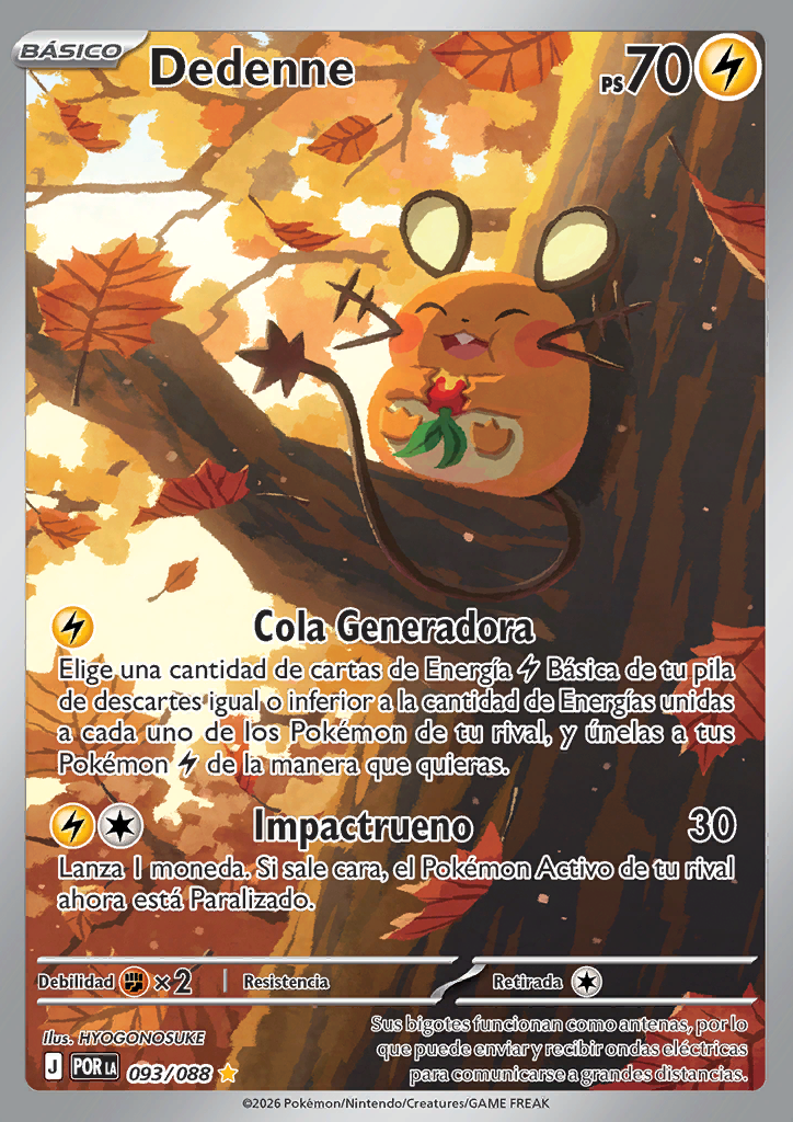 Generador Cola Elige una cantidad de cartas de Energía Básica de tu pila de descartes igual o inferior a la cantidad de Energías unidas a cada uno de los Pokémon de tu rival, y únelas a tus Pokémon de la manera que desees. |