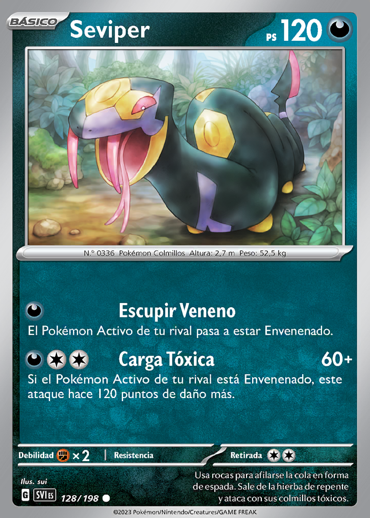 Carga Tóxica Si el Pokémon Activo de tu rival está Envenenado, este ataque hace 120 puntos de daño más. |