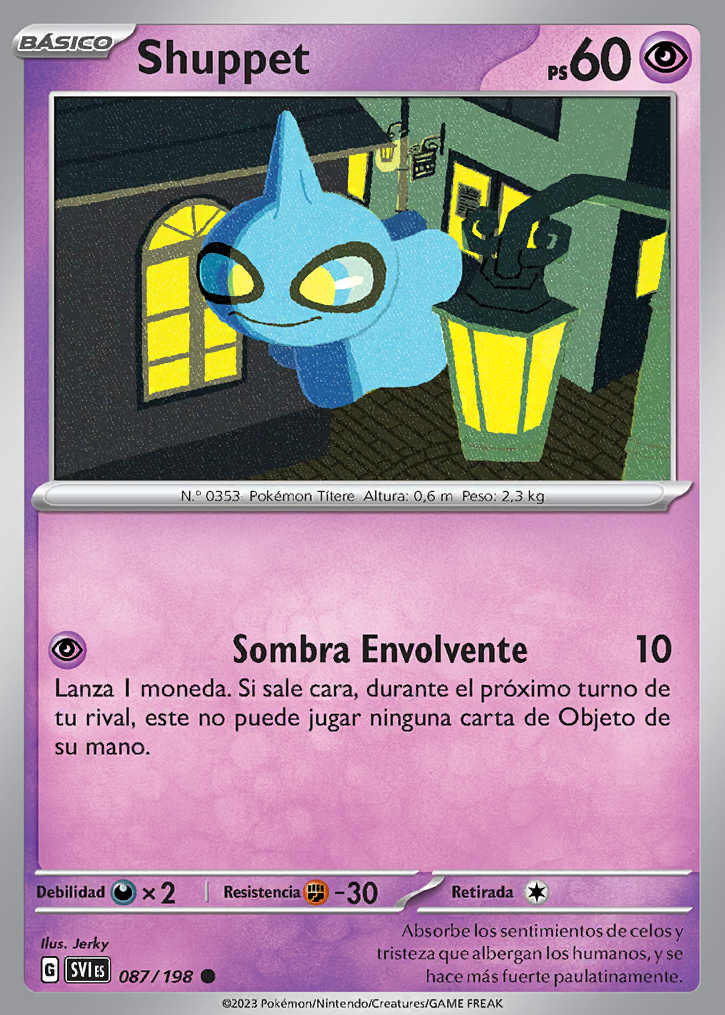 Sombra Envolvente Lanza 1 moneda. Si sale cara, durante el próximo turno de tu rival, este no puede jugar ninguna carta de Objeto de su mano. |
