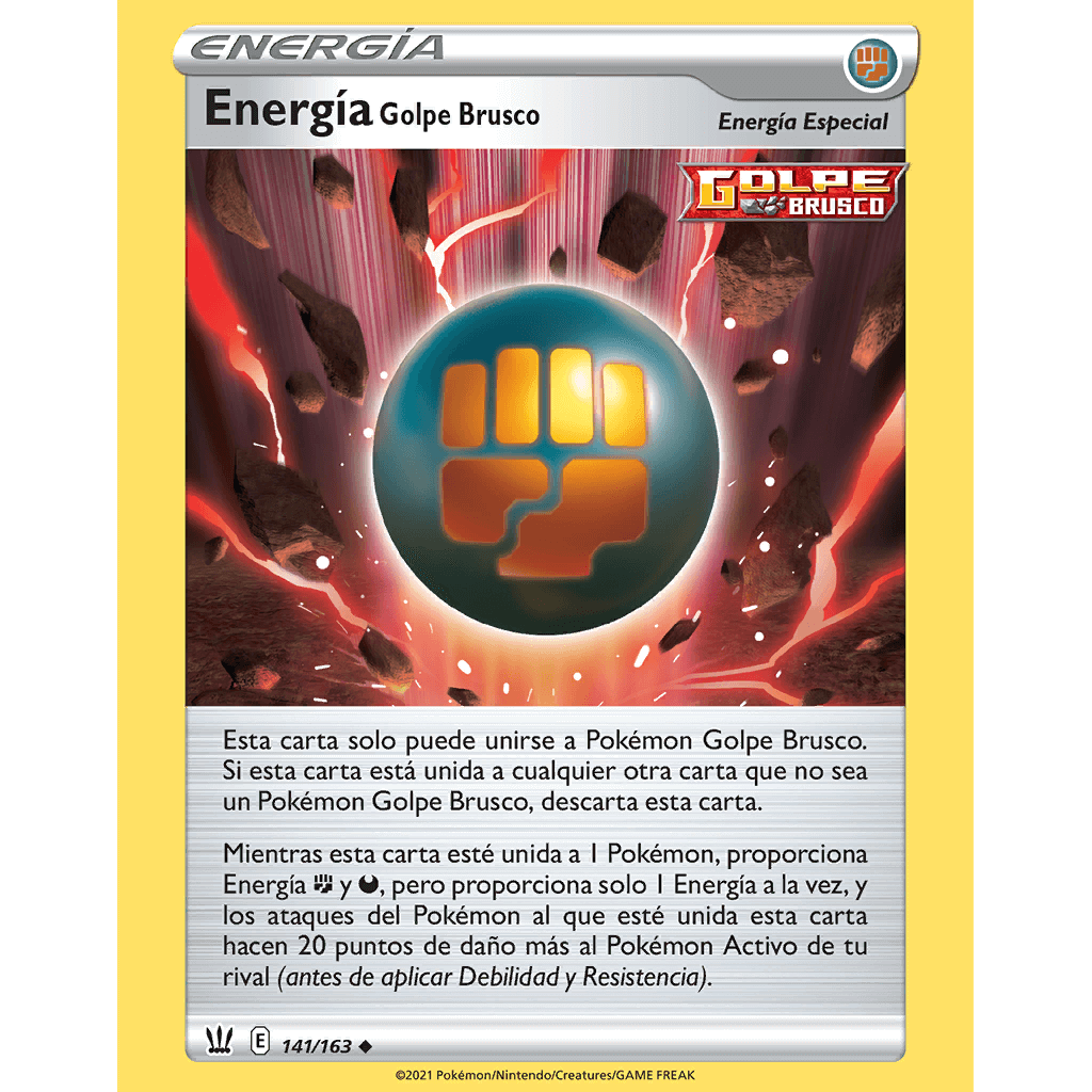 | Esta carta solo puede unirse a Pokémon Golpe Brusco. Si esta carta está unida a cualquier otra carta que no sea un Pokémon Golpe Brusco, descarta esta carta. Mientras esta carta esté unida a 1 Pokémon, proporciona Energía Fighting y Darkness, pero proporciona solo 1 Energía a la vez, y los ataques del Pokémon al que esté unida esta carta hacen 20 puntos de daño más al Pokémon Activo de tu rival (antes de aplicar Debilidad y Resistencia). |