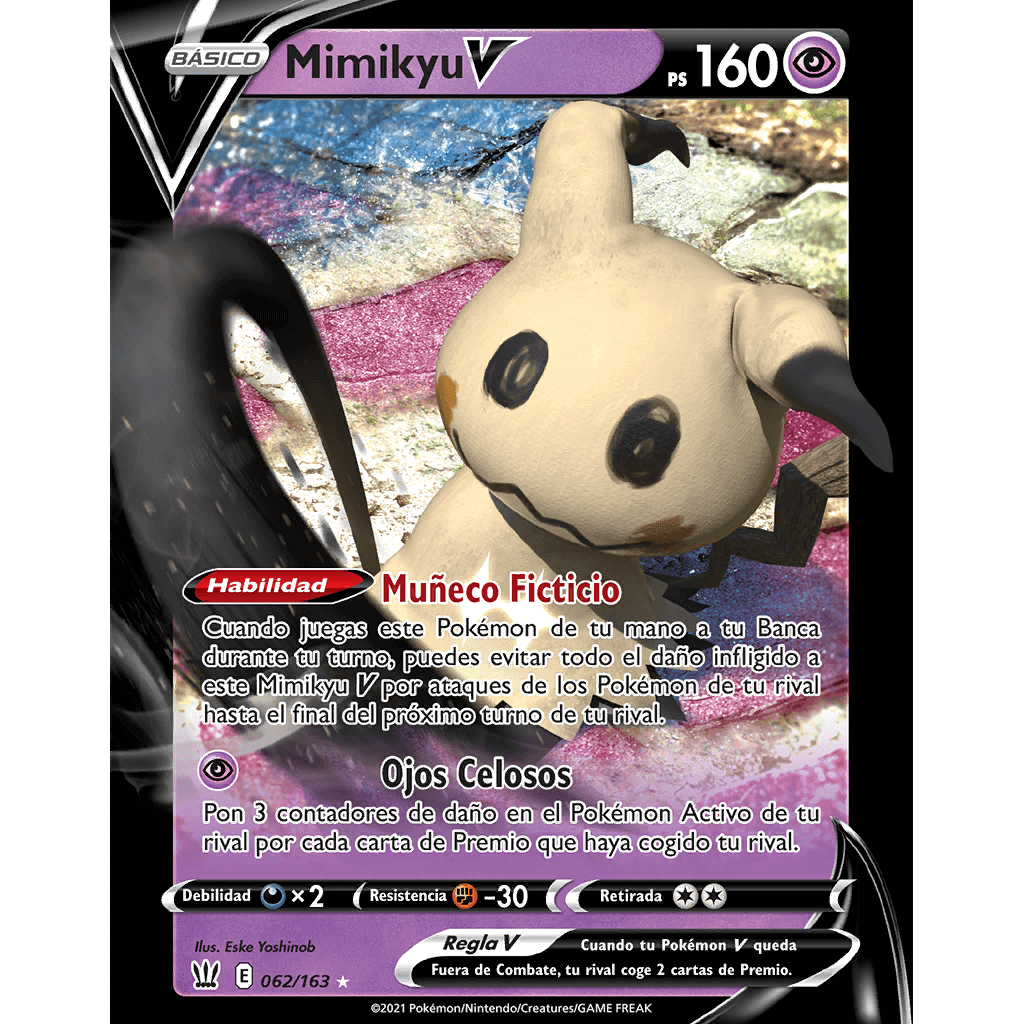 | Cuando juegas este Pokémon de tu mano a tu Banca durante tu turno, puedes evitar todo el daño infligido a este Mimikyu V por ataques de los Pokémon de tu rival hasta el final del próximo turno de tu rival. | |
