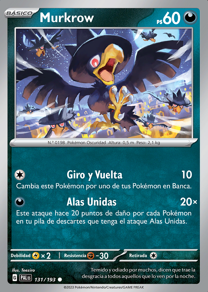 Alas Unidas Este ataque hace 20 puntos de daño por cada Pokémon en tu pila de descartes que tenga el ataque Alas Unidas. |