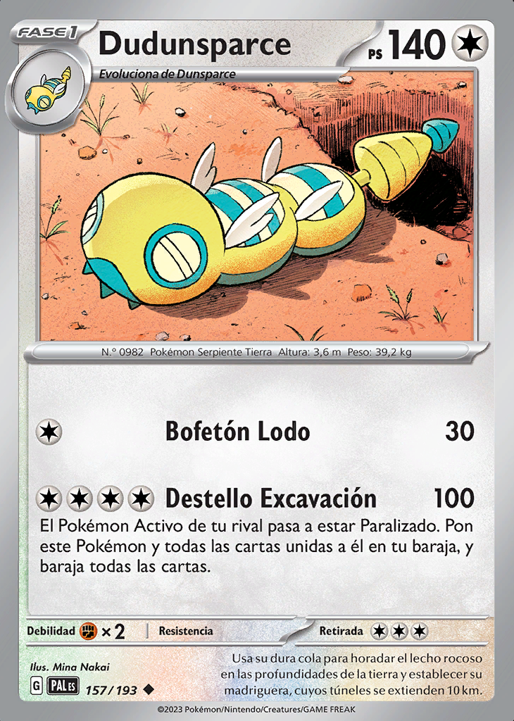 Destello Excavación El Pokémon Activo de tu rival pasa a estar Paralizado. Pon este Pokémon y todas las cartas unidas a él en tu baraja, y baraja todas las cartas. |