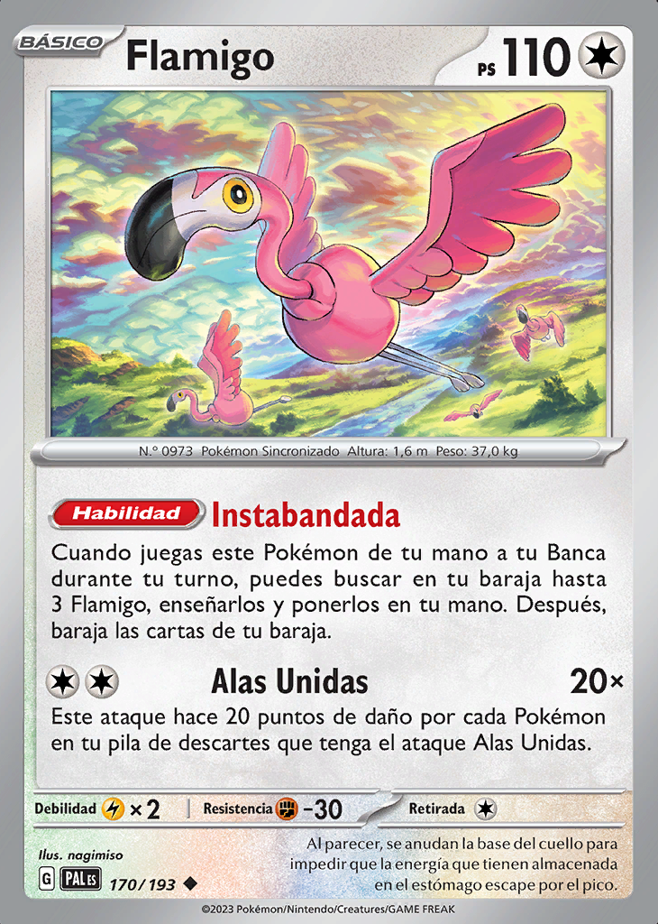 | Cuando juegas este Pokémon de tu mano a tu Banca durante tu turno, puedes buscar en tu baraja hasta 3 Flamigo, enseñarlos y ponerlos en tu mano. Después, baraja las cartas de tu baraja. | |